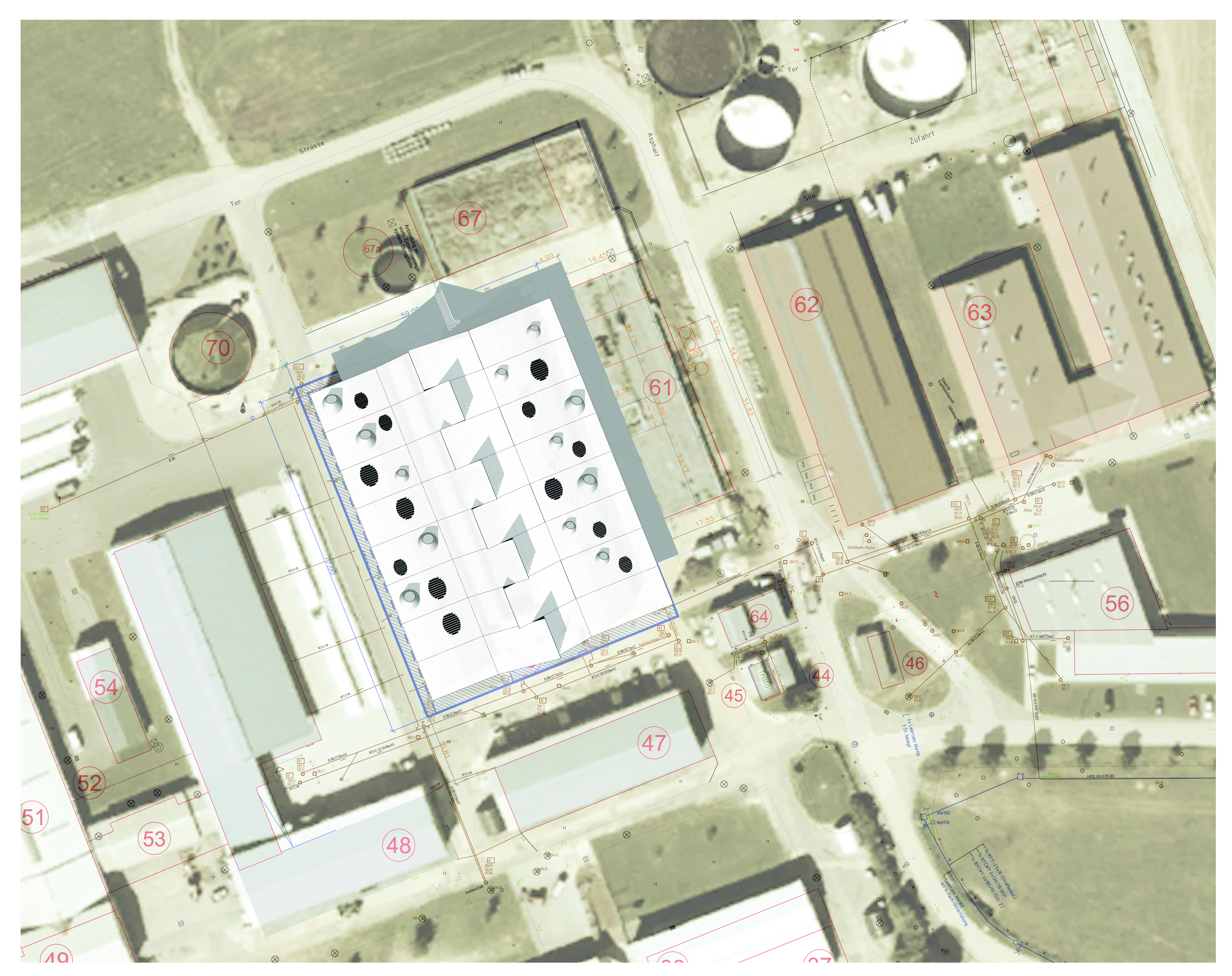 Die Größe der Lehrwerkstatt und die mehrreihige Anordnungder Aufstellung der Kühe verursacht bei konventionleller Dachausbildung von 10-24° eine enorme Hallenhöhe. Mechanische Verstärkungen der Luftbewegungen werden ausführlich nach Kosten/Nutzen Rechnungen untersucht erscheinen jedoch immer nur als Ausweg.